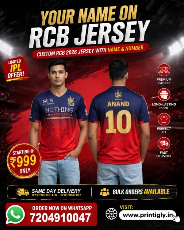 Custom RCB Jersey 2026 with your name and number. Navy-red gradient, gold star, sublimation print. Same-day pickup Bangalore. Pan-India delivery.